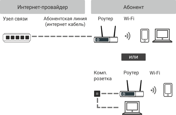 Например, если интернет-кабель соединен с роутером, то абонентская линия связи заканчивается до роутера. И подключенные к роутеру устройства не входят в линию связи (телефон, ноутбук, планшет и т.д.)