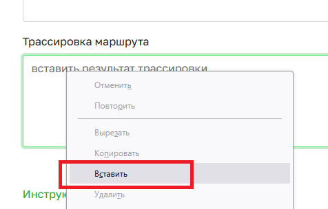 Правой кнопкой мыши нажмите в поле Трассировка маршрута, выберите в меню Вставить и вставьте скопированный результат.