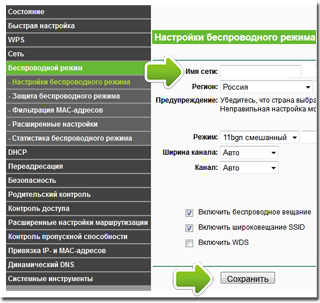 | 2.6. Далее слева выберите раздел Беспроводной режим. Здесь выберите раздел Настройки беспроводного режима. Нажмите кнопку Сохранить | ![]() |