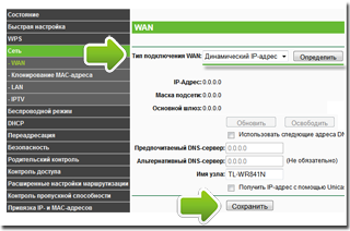 | 2.5. Слева в меню выберите раздел Сеть. В поле Тип подключения WAN должно стоять Динамический IP адрес Нажмите кнопку Сохранить | ![]() |
