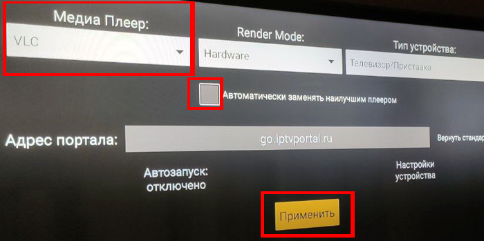 Если по каким-то причинам предустановленный медиаплеер не воспроизводит телевидение, зайдите в настройки IPTV PORTAL и смените медиаплеер.